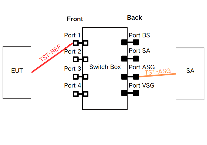 - 使用 TST-REF 将 EUT 与系统提示的对应的端口连接(EUT 与 Switch Box 前面的端口)
